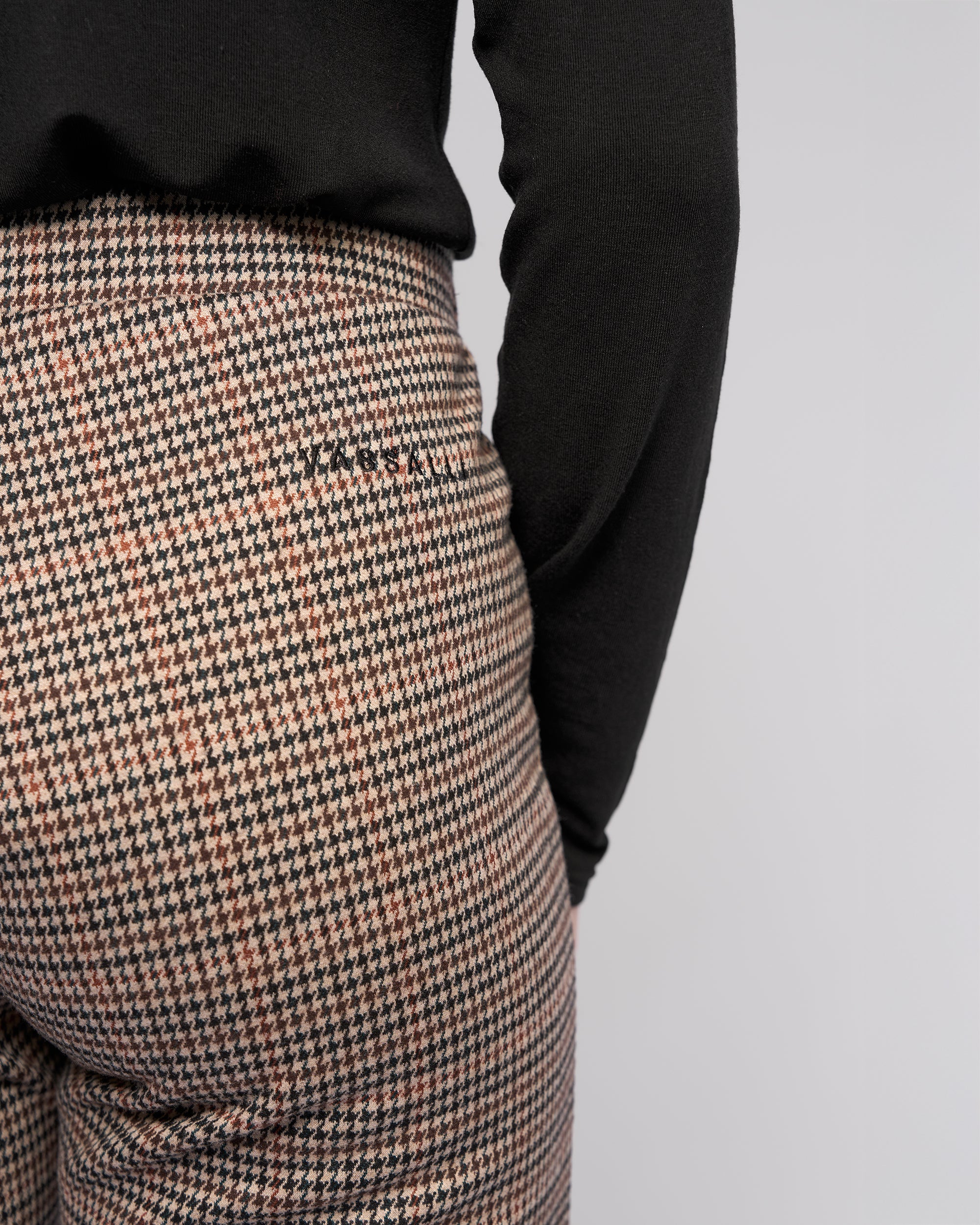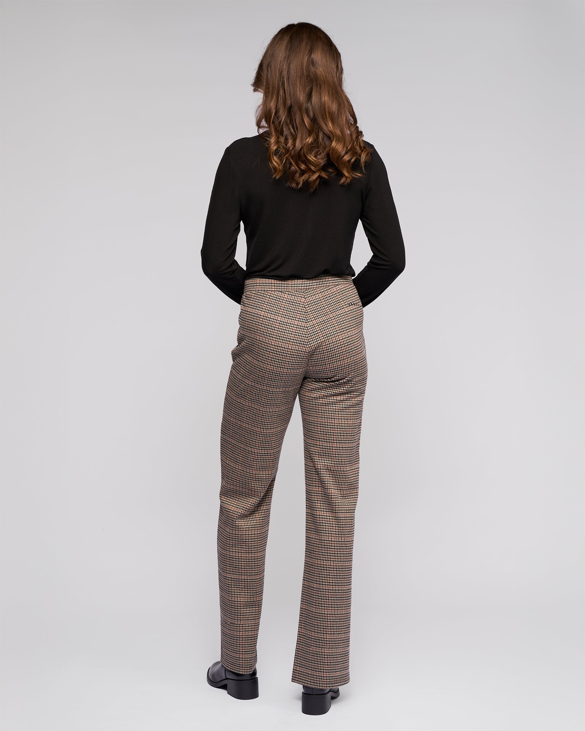 Full-length straight-leg pant in a soft knit fabric, designed in our Ezra print - an oat base with black and brown check and fine copper and forest green accents. The pull-on design with an elastic waistband offers everyday comfort, and the pant is finished with Vassalli logo embroidery at the back.