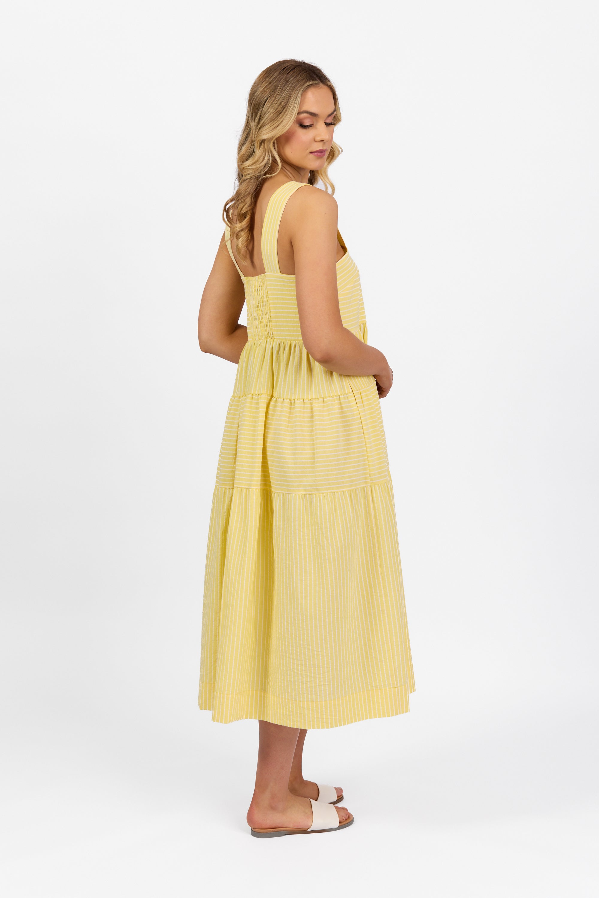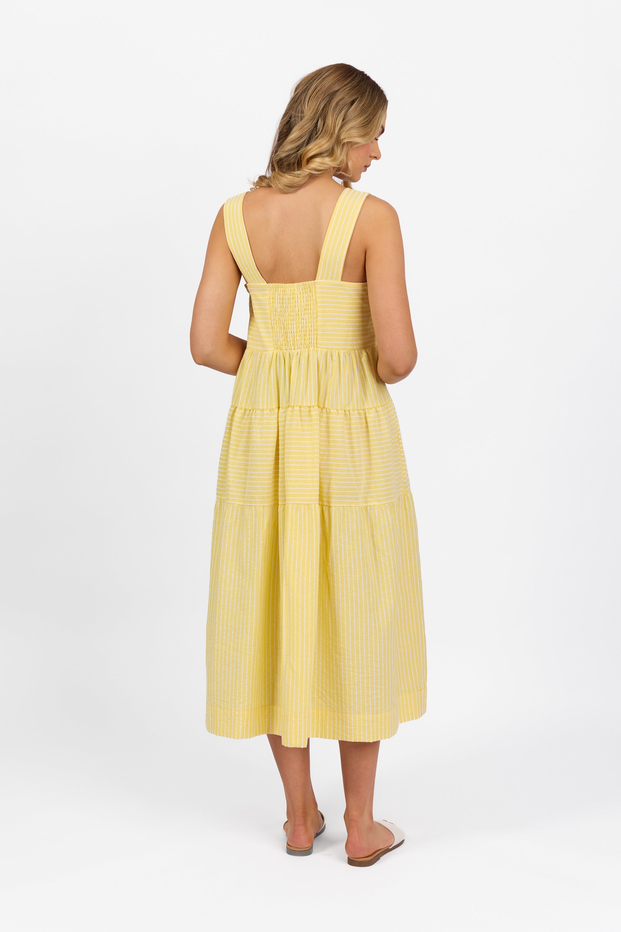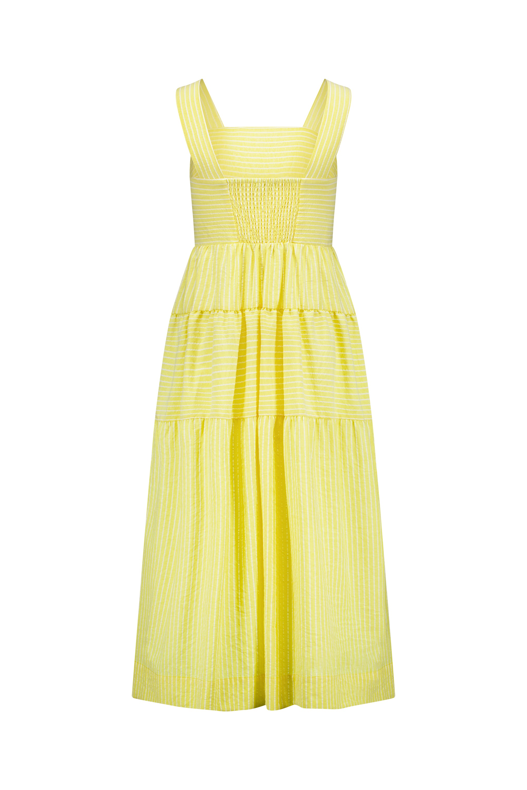 This sleeveless tiered dress is made from soft, lightweight 100% cotton in a fresh Lemon stripe pattern. Designed with wide straps and a shirred back panel, it offers a comfortable fit and an easy, elegant look for sunny days.