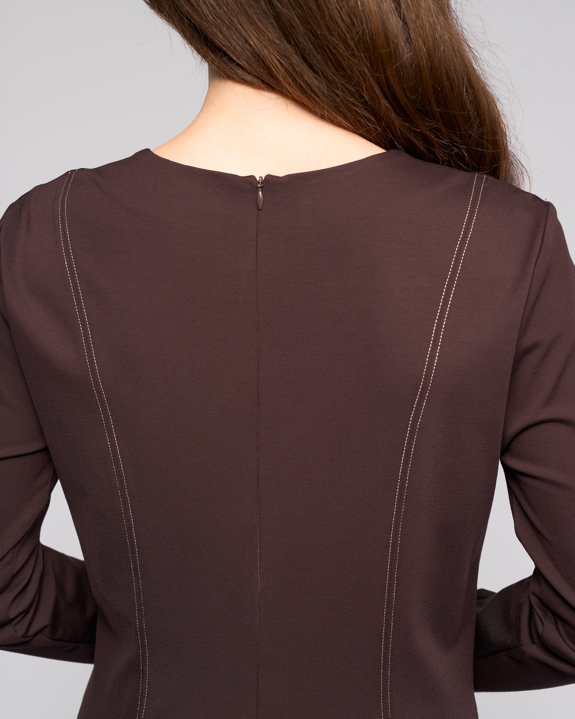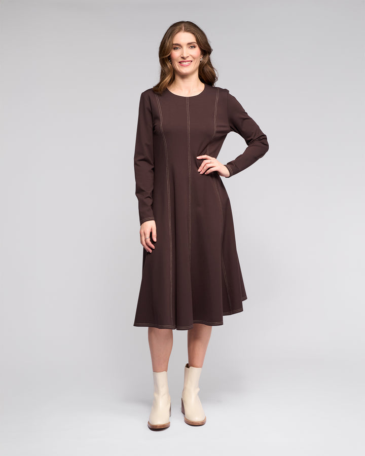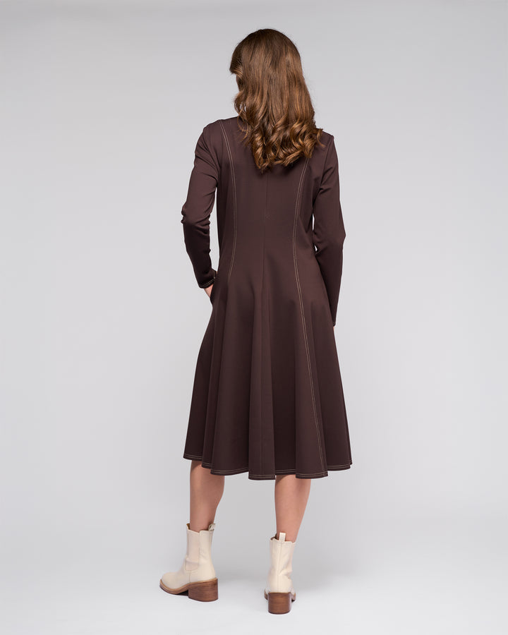 Midi-length dress in winter-weight ponti, designed in our Chocolate colour - a rich dark brown. Fitted through the body and gently flaring from the waist, it offers a flattering, refined silhouette with warmth and structure.
